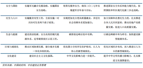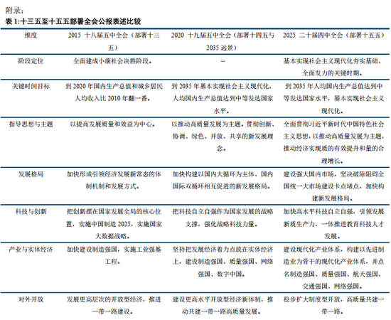 总的来看,从“十三五”到“十五五”,创新驱动与高质量发展贯穿始终。发展格局经历新常态阶段、双循环阶段、统一大市场阶段的递进。科技板块表述从创新驱动走向科技自立自强,再到新质生产力。开放表述则是从更高层次递进为更高水平,再到制度型开放。安全与国防从军民融合、统筹发展和安全,演进到国家安全体系与能力现代化“三步走”路线。民生政策从脱贫攻坚与人口政策调整,延展到就业质量和社会保障,再推进到房地产和人口高质量发展导向。